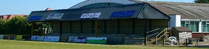 A full-length covered terrace blesses the Cheriton End of the Buzzlines Stadium. Its' low cover causes a great atmosphere which can really echo to all sides of the ground. To the left, the Club Shop and WIlf Armory Stand; to the right, across a standing area to the Club Bar - a perfect location for those who may want refreshments during the game! The Harvey Grammar School is situated behind the stand, which is visible behind the goal.